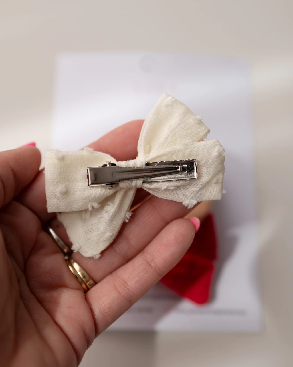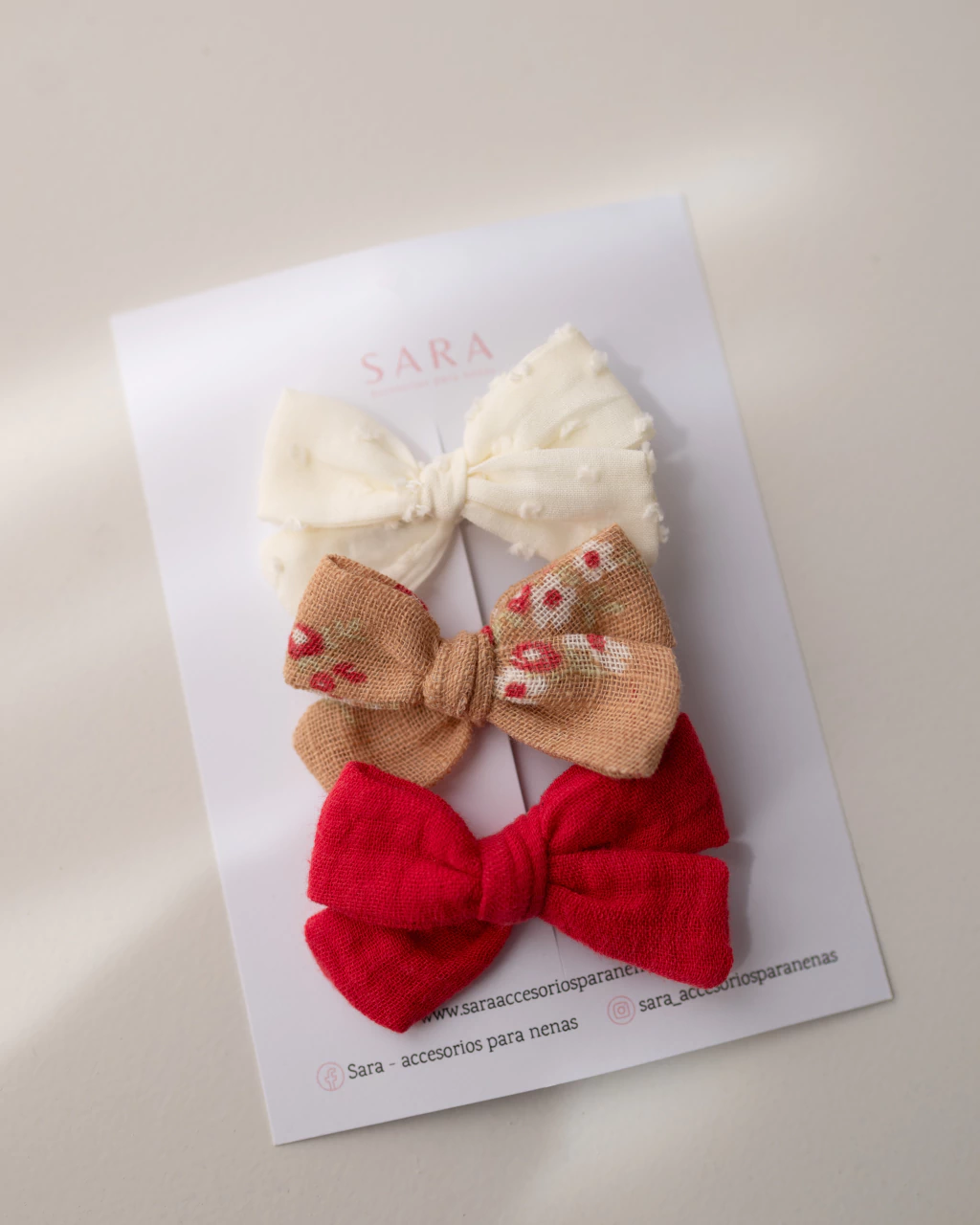 La opción ideal para lucir un solo moño importante o para llevar dos colitas si elegis dos sets iguales. Este set incluye tres moños diferentes en delicados tonos rojos y crema, perfectos para combinar con varias prendas y lograr peinados únicos.