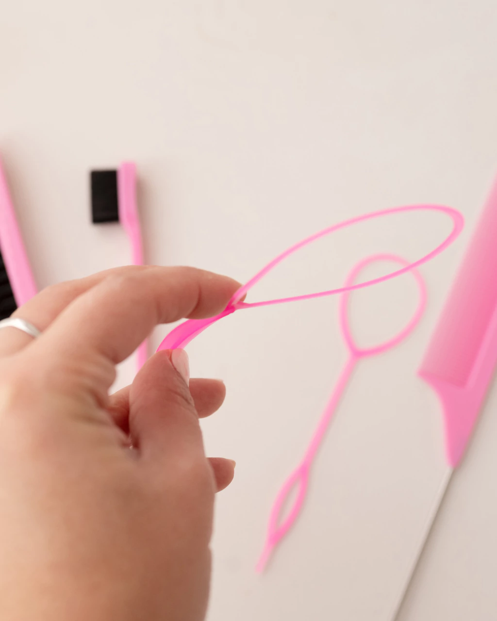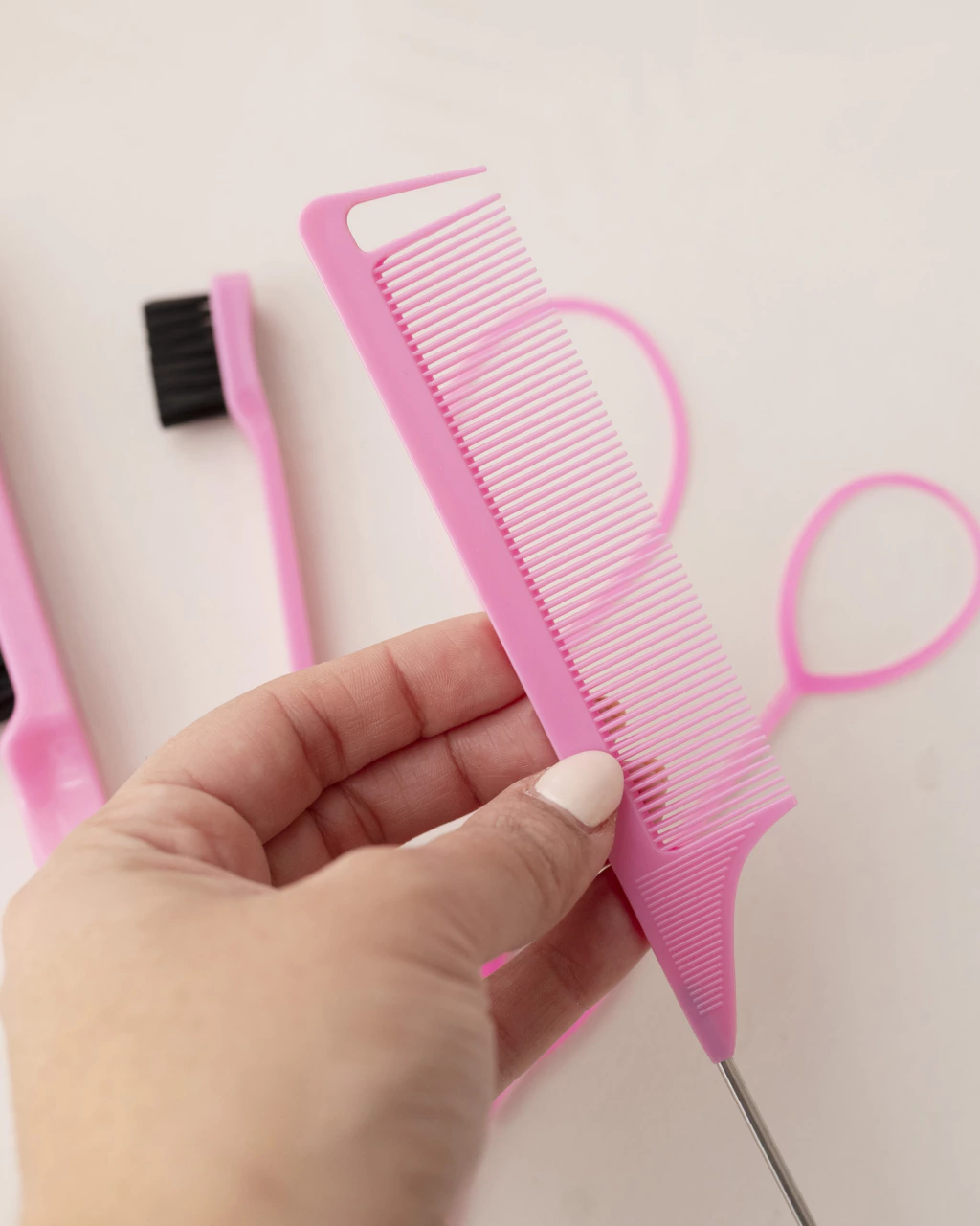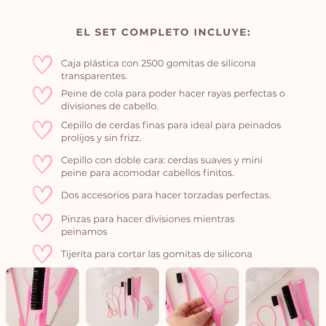 Este kit trae todas las herramientas esenciales para lograr peinados hermosos y bien hechos. Ideal para el día a día de los peinados con nuestras hijas, como para momentos especiales combinandolo con nuestros moños.