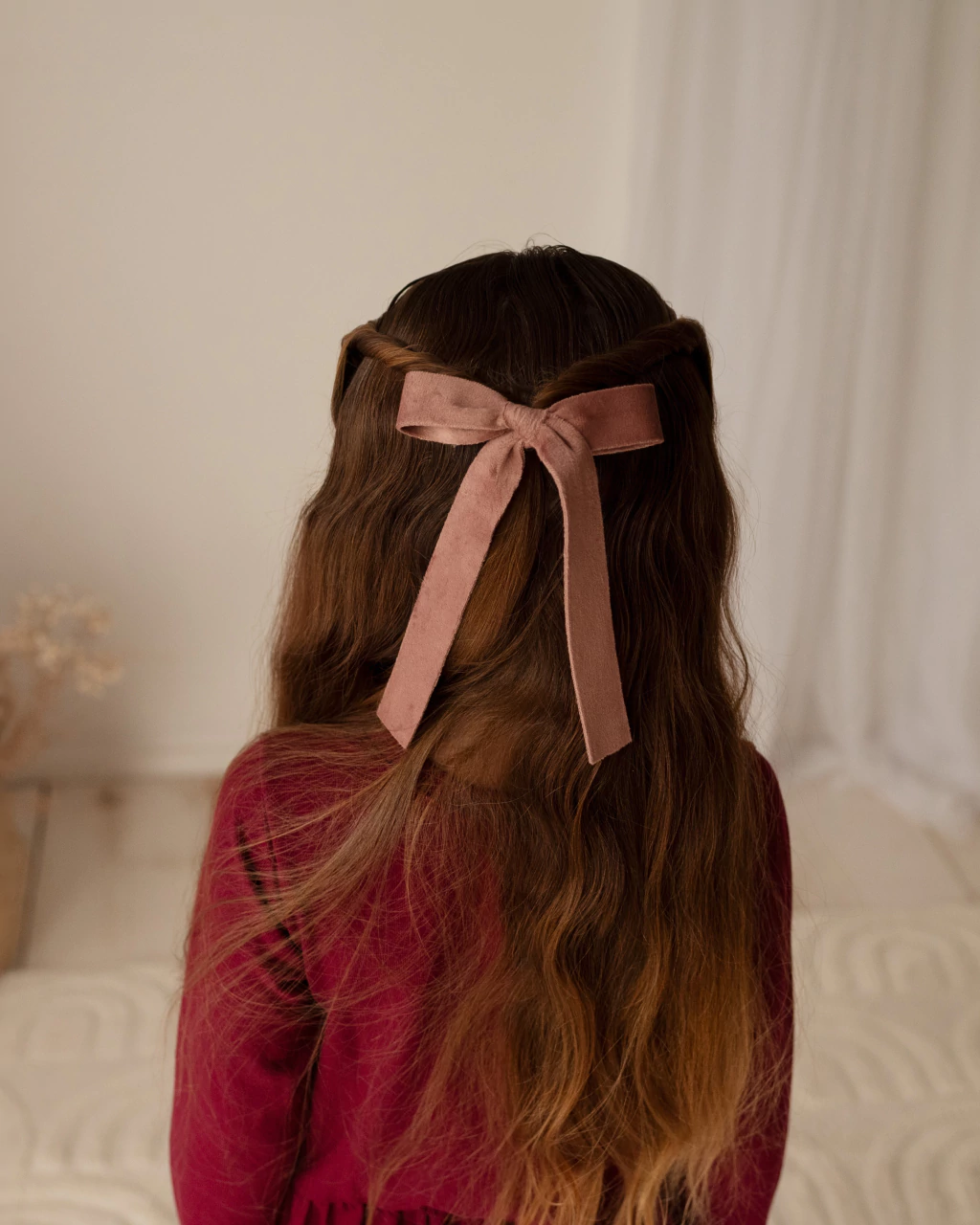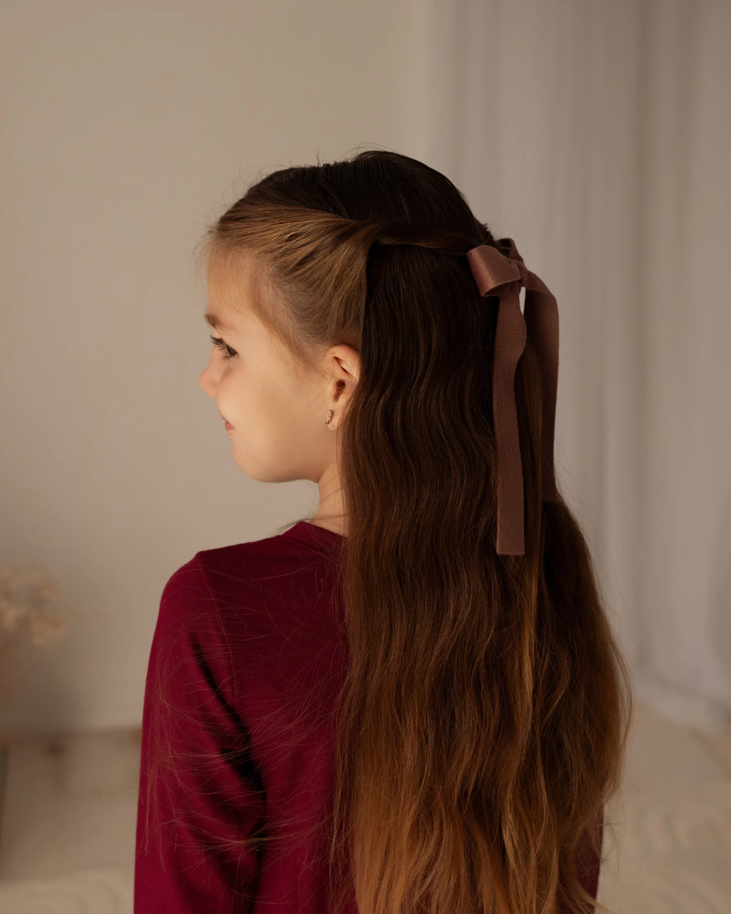 La nena de la foto tiene 6 años, recomendamos estos moños para cualquier nena que el pelo le sobrepase los hombros.